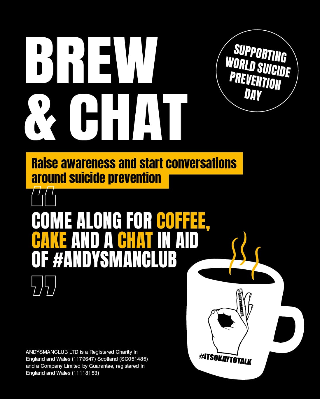 Help raise awareness of men’s mental health by supporting ANDYSMANCLUB with your own “Brew & Chat” Day.